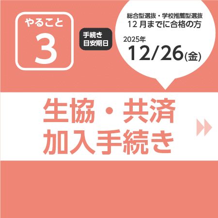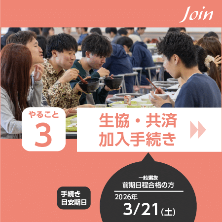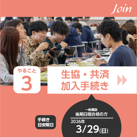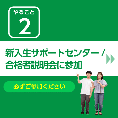 新入生サポートセンターへご来場いただくか、オンライン開催の合格者説明会に必ずご参加ください。来場型の場合、生協でのご入学準備に必要な手続きや住まい探しを先輩学生がサポートします。