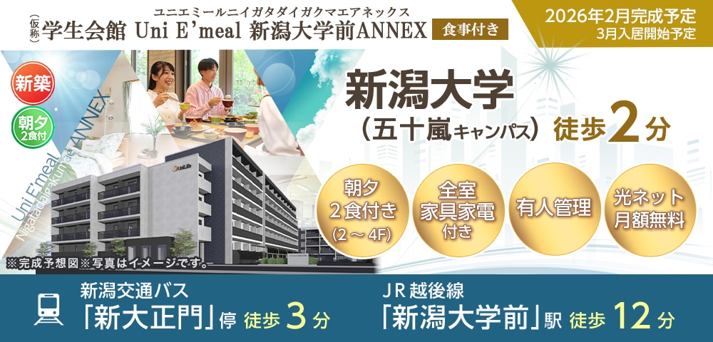 新潟大学生協の推奨する管理栄養士監修の学生会館のご紹介です。2026年完成予定の新築物件もございます。物件によって食事の有無が異なっております。各バナーのリンク先をお確かめください。