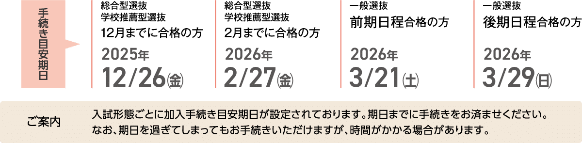 期日を過ぎても手続きはできますが、ガイダンス時から教科書販売などが開始されます。手続き後スムーズな大学生活をスタートできるよう、加入手続きは下記日程までにお願いいたします。