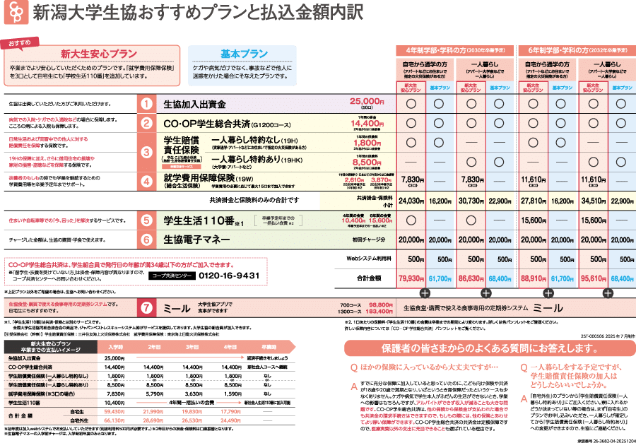 新潟大学生協では全ての新入生にプランでの加入をお願いしております。