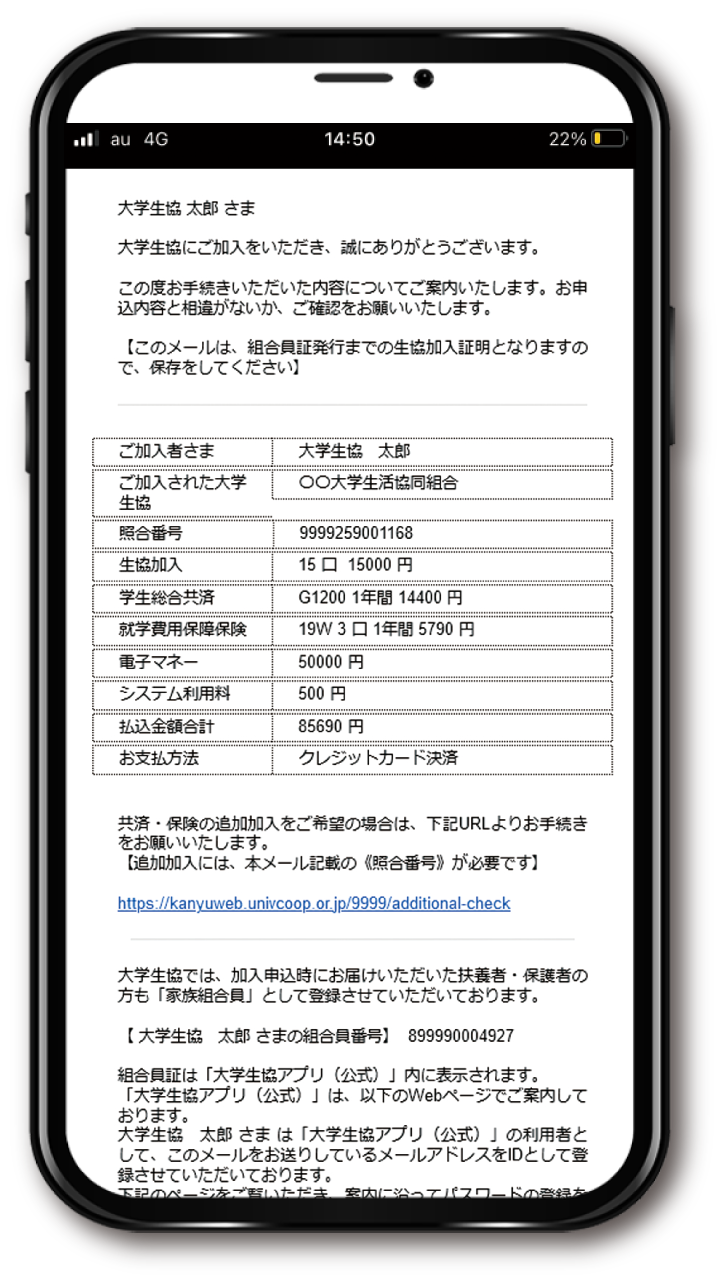 メール本文にて、今回お申し込みいただいた内容と、「追加申込方法」「照合番号」、「組合員番号」「大学生協アプリ利用方法」をご案内しますので、必ずご確認・保存をお願いいたします。