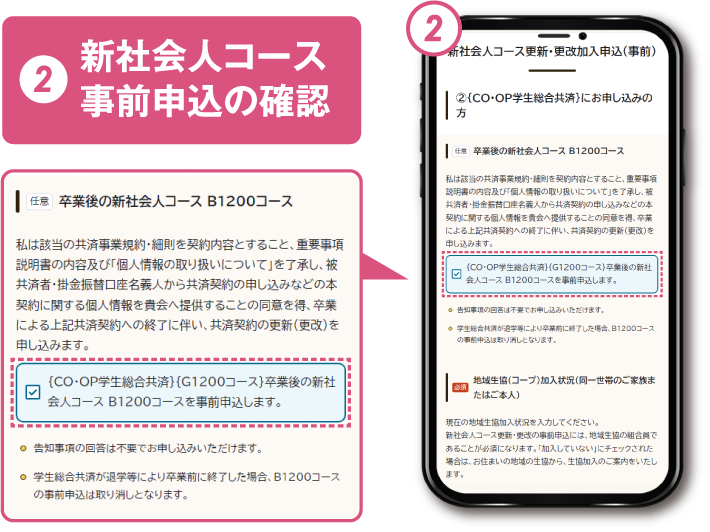 - 共済加入手続き完了後の学生総合共済新社会人コース事前申込は、共済マイページよりお手続きいただけます。または、コープ共済センター(0120-16-9431)にお電話でお申し出ください。