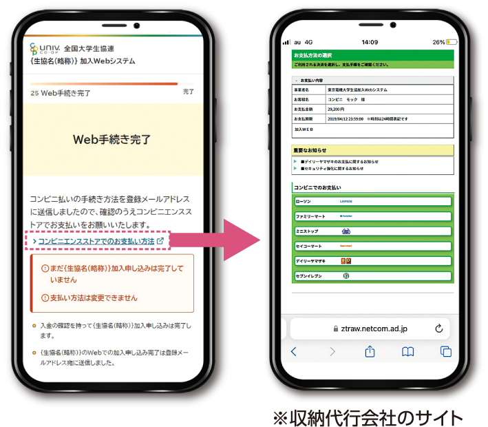 「コンビニエンスストアでのお支払い方法」リンクをタップすると、収納代行会社のサイトに移ります。ご希望のコンビニを選択し、指示に従って進めてください。(コンビニ各社によって、支払いの手順が異なります。)