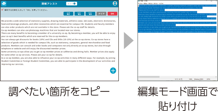調べたい文章・単語をコピペするだけで検索。効率的に読解が進められます。