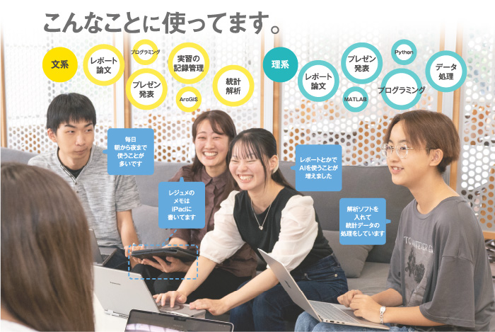 パソコンは文理問わず、授業・研究・レポート作成・データ処理など、あらゆる場面で使われています。AIやiPadと組み合わせて活用することで、学習効率を上げています。