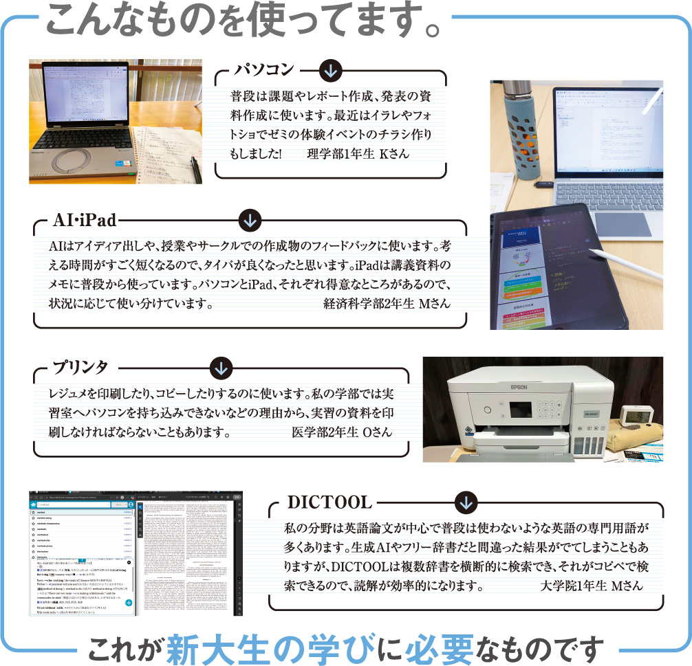 - iPad:講義ノートや課題のPDF閲覧、手書きメモに活用