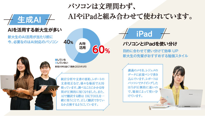 パソコンは文理問わず、授業・研究・レポート作成・データ処理など、あらゆる場面で使われています。AIやiPadと組み合わせて活用することで、学習効率を上げています。