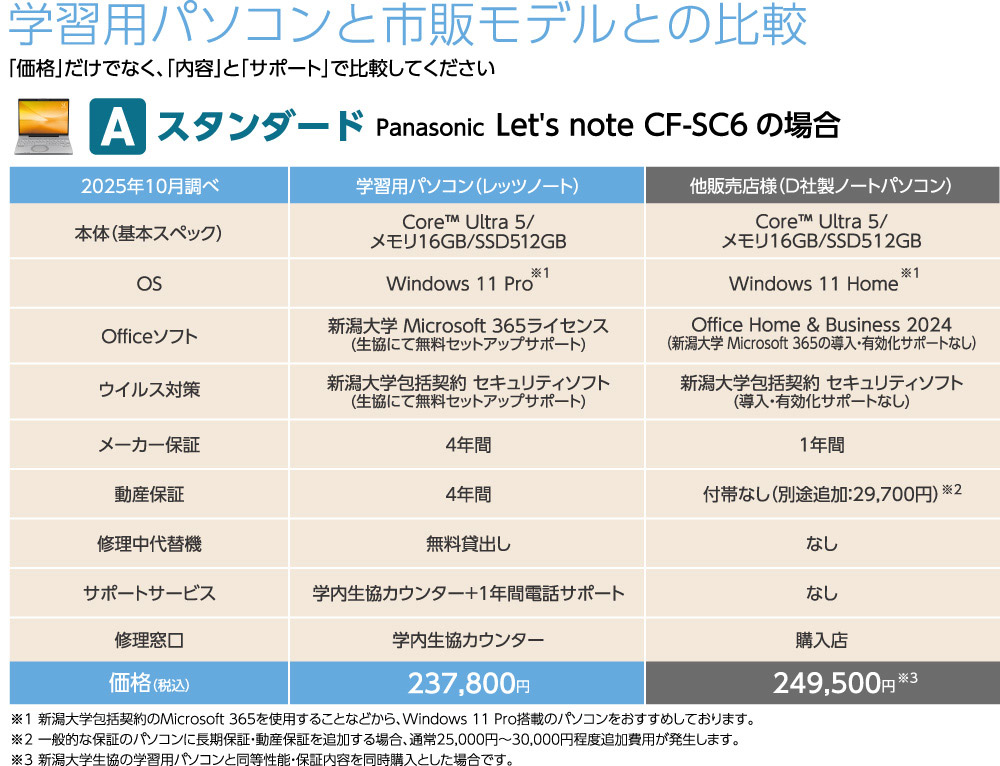必ずお読みください新潟大学の「携帯型パソコン必携」に関する内容を含め、学習用パソコンのご用意については、合格後に郵送されるパンフレットおよび新入生サポートセンター・合格者説明会にて詳細をご案内します。携帯型パソコン必携の要件と適合しない機種をご購入される恐れもありますので、合格後直ぐのパソコン購入はお控えいただくことをおすすめいたします。