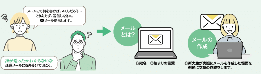 - 新大生が実際にメールを作成した場面を例題に文章の作成をします。