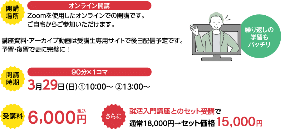 詳しい日程や登録方法につきましては、講座お申込み後に別途ご案内させていただきます。